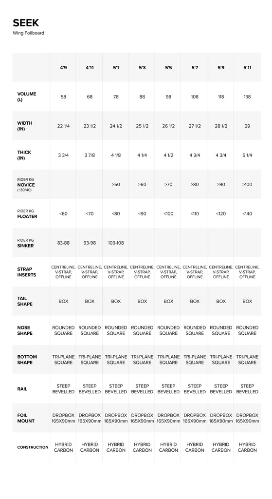 Let the Seek wing-foil board take you places you’ve never been. Upwind, downwind, ocean roller or lake. The 2025 Seek has a balanced design for clean release and a comfortable stance. The efficient tri-plane hull design with a slight convex at the tail provides a smooth, forgiving touchdown recovery. To improve speed and acceleration, we’ve increased the length, decreased the width and reduced the overall weight of the board for more on-water efficiency and earlier lift onto foil. Engineered for an intuitive and direct connection to your hydrofoil, the Seek has a stiff, responsive, Hybrid Carbon construction with deep-concaved deck for greater leverage and heel/toe roll control. Early takeoffs. Effortless touchdown recovery. Easy gybes, tacks and controlled jumps.