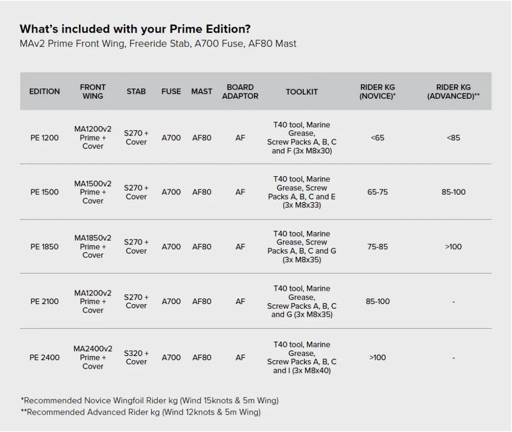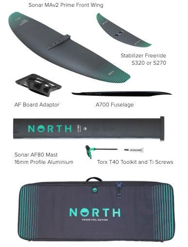 Sonar Foil Mast AF80, Sonar S270 Stabilizer with Cover, Sonar A700 Fuselage, Sonar AF Board Adaptor, Sonar Board Adaptor Screw Pack A, Sonar Fuselage Screw Pack B, Sonar Stabilizer Screw Pack C, Sonar T40 Tool, Sonar MAv2 Prime Front Wing with Cover, PE1200: Sonar Wing Screw Pack F (M8x30mm), PE1500: Sonar Wing Screw Pack E (M8x33mm), PE1850/PE2100: Sonar Wing Screw Pack G (M8x35mm), PE2400: Sonar Wing Screw Pack I (M8x40mm), Marine Grease, Sonar Travel Bag